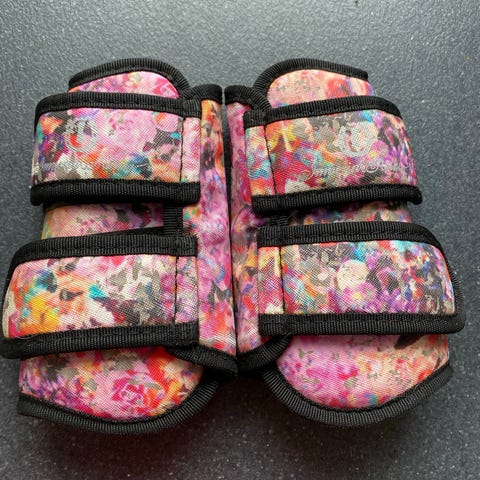 Gamacherne har blød foret inderside og yderside i glat materiale. De lukkes med to elastiske velcrostropper med guldglimmer og SD Design-logo. Velegnet til brug på ponyben for støtte og beskyttelse under ridning eller træning.