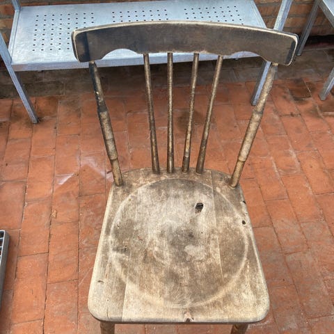 Træstol med udskårne detaljer i ryg og armlæn samt flet i den øverste del af ryggen. Sædet er polstret og betrukket med mønstret stof i lyse og rødlige nuancer. Stolen har drejede ben og tværstivere, der giver et klassisk og dekorativt udtryk. Velegnet som spisebordsstol, lænestol eller som dekorativ stol i stue eller entré.