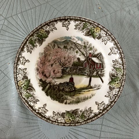 Wood & Sons Woodland tallerkener i blå-hvidt porcelæn med klassisk landskabsmotiv. Tallerkenerne har dekoreret bort med blomster og detaljeret midtermotiv. Fremstillet i Burslem, England. Velegnet som spisetallerkener eller til servering og som del af en samling af engelske stel i blå-hvid porcelæn.
