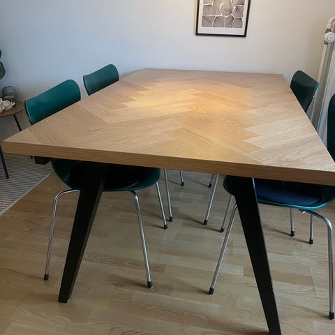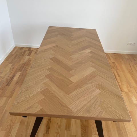 Sælger dette super fine sildebensbord. Den øverste halvdel af bordet er i massiv eg. Den nederste del er MDF-plade.