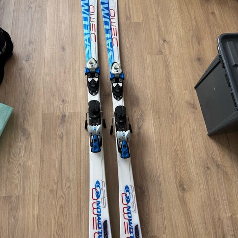 Salomon Equipe ski på 160 cm i blå farve med monterede bindinger. Alpinski egnet til pistekørsel. Undersiden viser almindelige brugsspor.