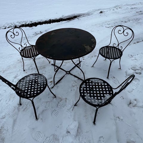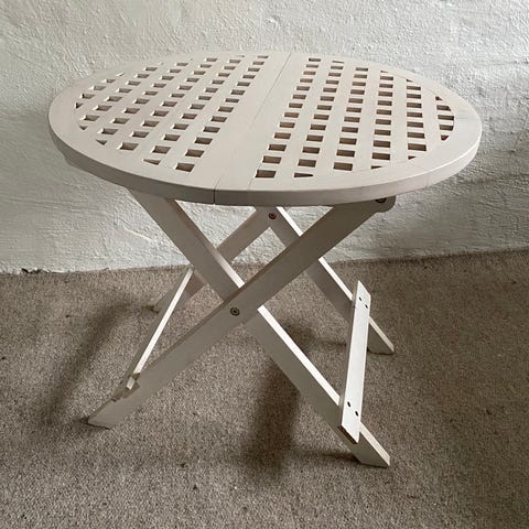 Rundt havebord med tilhørende klapstole i sæt. Bordet har rund bordplade i lyst træ med metalben i hvid. Stolene er klapstole med sæde og ryglæn i lyst træ og stel i hvidt metal. Sættet er egnet til brug på altan, terrasse eller i haven og kan klappes sammen for nem opbevaring. Sættet er I Brande men kan leveres I Århus Silkeborg og Herning område for en lille merpris