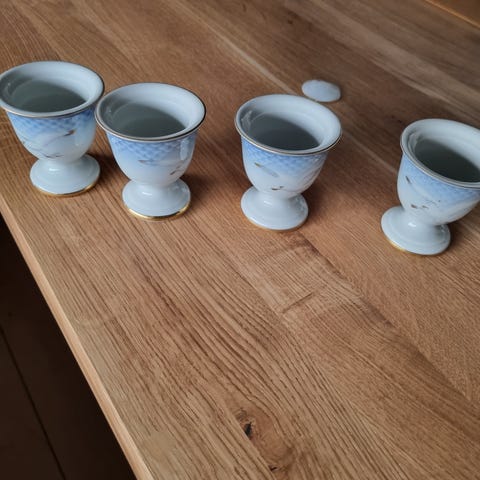 Bing & Grøndahl Måge æggebægre i porcelæn. Sættet består af fire æggebægre med klassisk blå/hvid dekoration med mågemotiv og skælkant øverst. Velegnet til servering af blødkogte eller hårdkogte æg ved morgenbordet eller brunch. Designet passer sammen med øvrige dele i Måge-stellet fra Bing & Grøndahl. 1.sort trods lille blå plet kant af ene. Samlet pris