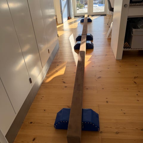 Sælger skumbom som måler 240 cm i længden og 10/15 cm i bredden. Kan foldes på midten så den er lettere af opbevare.