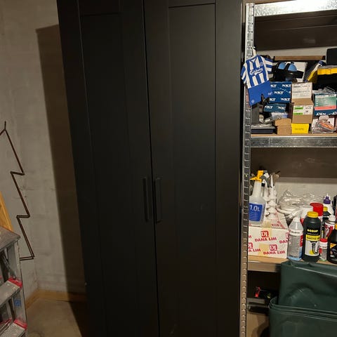 IKEA garderobeskab i hvid. Skabet har to låger og indvendigt en bøjlestang samt en hylde øverst, hvilket giver plads til ophængning af tøj og opbevaring af fx kasser eller foldet tøj. Velegnet til brug i soveværelse, børneværelse eller entré til opbevaring af tøj.