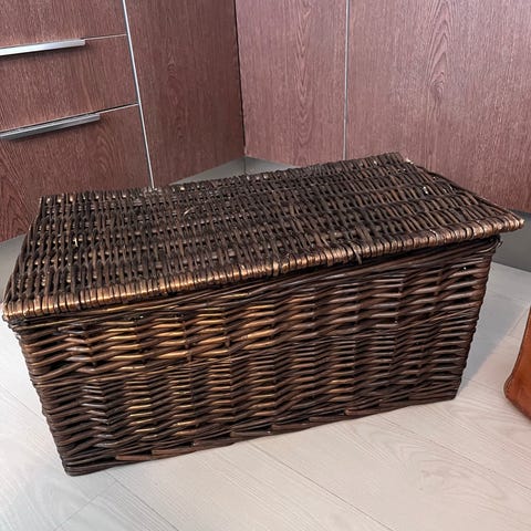 Sælger denne charmerende og rummelige kurvekiste (også kendt som en fletkiste eller kurvekuffert). Kisten er udført i et tidløst design af lyst flet, der passer perfekt ind i det nordiske hjem eller til den franske landstil.