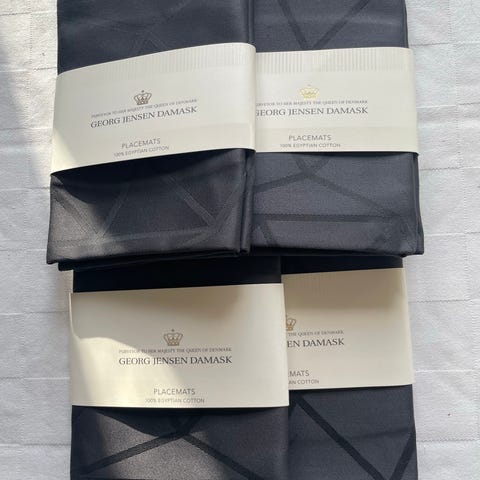 Georg Jensen Arne Jacobsen dækkeserviet i antracit med geometrisk mønster. Størrelse ca. 50 x 37 cm. Velegnet som underlag på spisebord eller køkkenbord for at beskytte overfladen og give et ensartet udtryk. Leveres som sæt af 2 ifølge mærkatet på emballagen. Sælges 8 styk for 1000 kr. kontakt mig hvis du ønsker at købe færre.