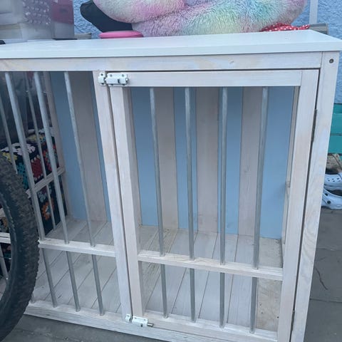 Flot hundebur bygget af Kokaa Pet Furniture. Huset har lamel-sider og åben front, som giver ventilation og udsyn for hunden. Det er velegnet som hvile- og soveplads til mindre hunde. Overfladen kan også bruges som lille bord- eller opbevaringsflade i stuen. Leveres som usamlet møbel i massivt træ med plads til pude eller hundeseng indeni (skumpude medfølger).