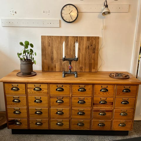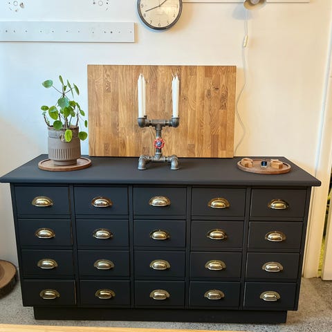 Nyrenoveret købmandsdisk – sort & lys trætop – 9 skuffer + 2 skabe