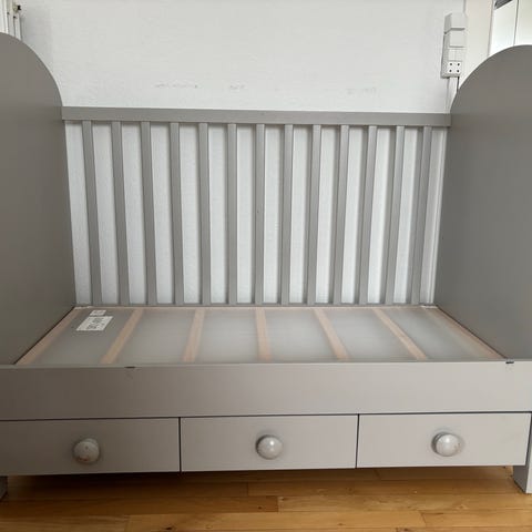 IKEA tremmeseng i grå med tremmer hele vejen rundt og tre integrerede skuffer under sengen til opbevaring. 120x60. Kan sættes højt og lavt.