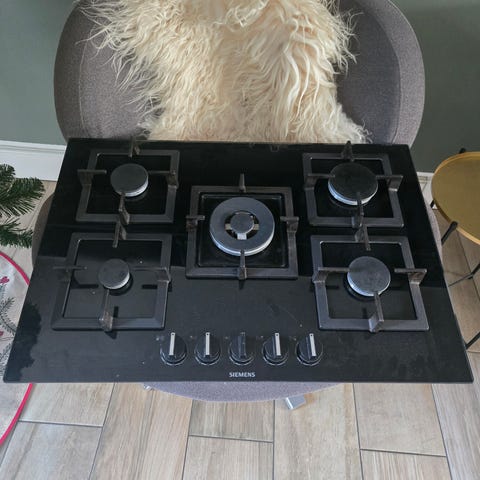 Siemens gaskogeplade med fire brændere på sort glasoverflade. Betjenes med 4 drejeknapper på fronten. Kogepladen har støbejernsrist over brænderne og er beregnet til indbygning i bordplade, som vist på monteringsillustrationen. Egnet til almindeligt køkkenbrug, hvor der ønskes gasblus til madlavning.