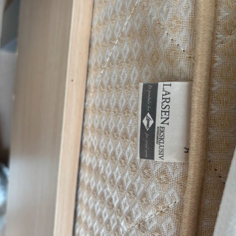 Larsen seng med madras og elevation . Den er lys, mønstret betræk. Sengen fremstår som enkeltseng og er velegnet til soveværelse, gæsteværelse eller ungdomsværelse. Madrassen har quiltet overflade og ligger på en fast bund. Egnet til daglig brug eller som ekstra soveplads.Man ligger fantastisk i den og top madrasser kan tilkøbes. Den har kostet over 10.000 kr og været brugt under 20 gange.