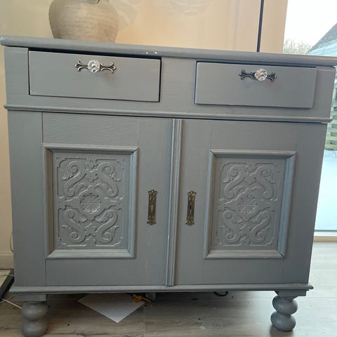 Skænk fra først i 1900' tallet i brunlakeret træ med to låger og to skuffer. Lågerne har udskårne detaljer på fronten og messing beslag ved greb og låse. Møblet står på korte ben og har en topplade, der kan bruges til dekoration af mindre genstande. Rummelig skænk som er velegnet til opbevaring i stue, spisestue eller entré.