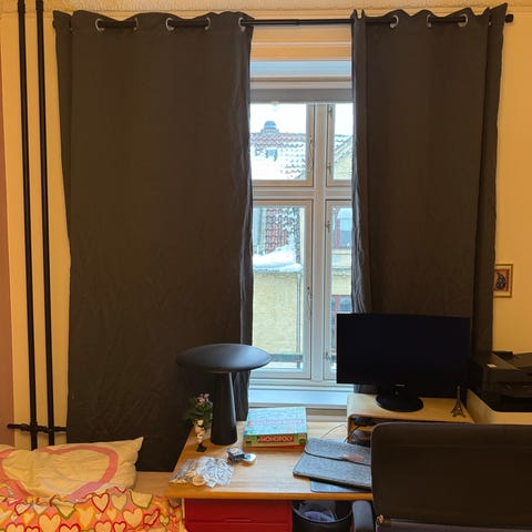 Der er to gardiner og en IKEA gardinstang.