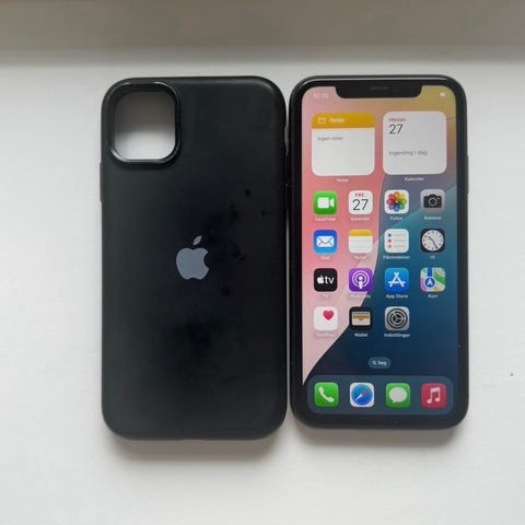 Sort iPhone 11 64 GB i original iPhone-æske som vist på billederne.