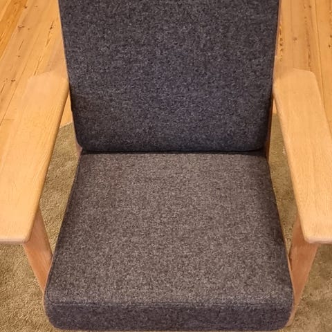 Meget velholdte skum hyndesæt til Hans J. Wegners GE 290 og GE 240 lænestole - betrukket af professionel med møbeluld i koksgrå.