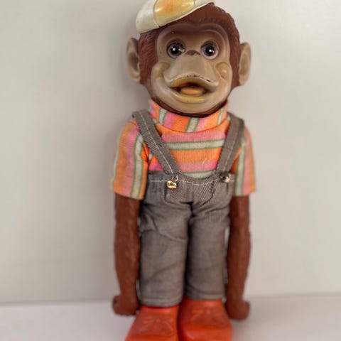 Karakteristisk krøllet eller "shaggy" lys pels, en brun broderet næse og et smilende ansigt. Et af de mest fremtrædende træk er de brune trædepuder med et poteaftryk-design. Højde ca. 19 cm.