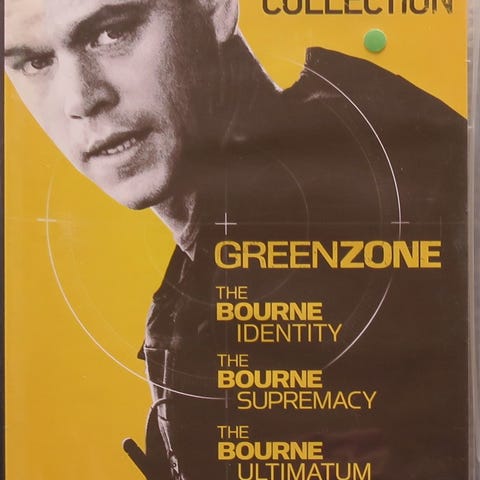 Action Collection dvd-boks med filmene "Green Zone", "The Bourne Identity", "The Bourne Supremacy" og "The Bourne Ultimatum". Medietype er dvd, og boksen er mærket med aldersgrænsen 15 år. Velegnet til afspilning på standard dvd-afspillere, der understøtter regionen angivet på omslaget.