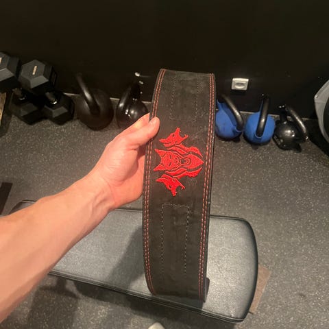 Dertil et vægtløfterbælte, som er brugt lidt, og fungerer som det skal. Har været ret glad for bæltet, men løfter ikke tungt på dén måde længere.