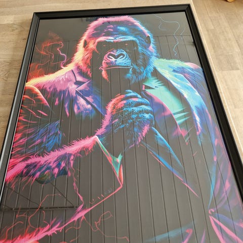 Eksklusiv virkelighedstro aluminimum printet fotografi af detaljeret gorilla i mørke naturlige nuancer. Velegnet som vægdekoration i den store stue, kontor eller lignende rum med tyngde. Original pris 2.975kr.