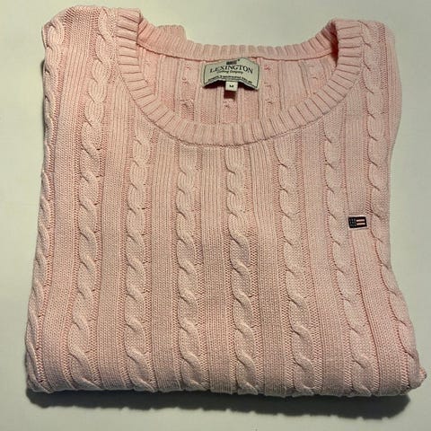 Klassisk kabelstrik med rund hals og ribkant ved hals, ærmer og bund.