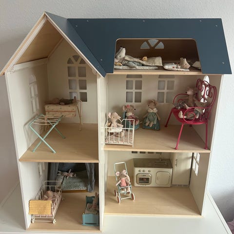 IKEA dukkehus i træ med blå tagkant. Huset er udformet som et klassisk hus med flere rum i to etager. Indvendigt er der forskellige mønstrede bagvægge, som giver variation mellem rummene. Velegnede til Maileg mus og møbler eller andre små figurer eller som udstillingsreol på børneværelset.