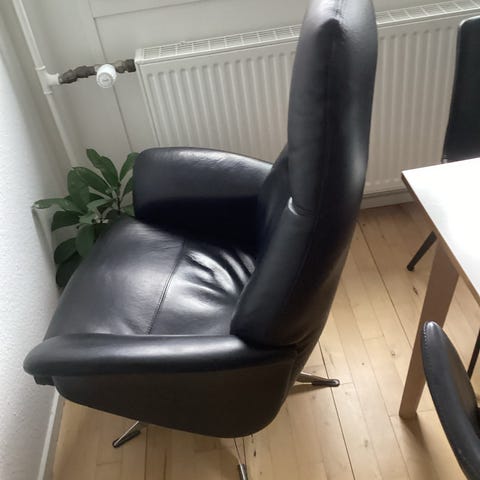 Læder med drejefod samt kan justeret i ryg. Vi har 2 stk læder stole og en taburet. Pris 350 pr stk