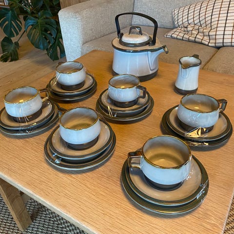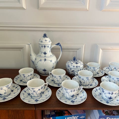 Testel af Edith Sonne fra Bing & Grøndahl sælges samlet for 650,00 kr. Te kopperne har nr. 473 og er alle i 1. sortering. Koppen har en diameter 10,5 cm og er 5,5 cm høje. Underkoppen har en diameter på 16 cm. Te kanden har nr. 855 og er i 2. sortering, tror fejlen er de 3 pletter på låget. Den har en diameter på 28 x 21 cm og er 12,5 cm høj.