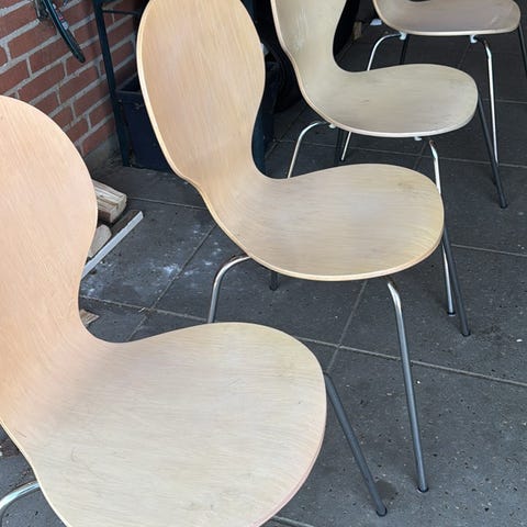 IKEA stol med sæde og ryglæn i formspændt træ og ben i metal. Stolen har afrundet ryglæn og sæde med synlige skruer i ryggen. Understellet består af fire slanke metalben, der er samlet i kryds under sædet. Egnet som spisebordsstol eller ekstra siddeplads i stue, køkken eller kontor.