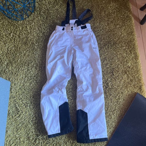 Skibukser med seler i to farver: én gul og én blå. Begge par har forstærkninger ved underbenene og justerbare seler. Velegnede til brug på ski eller andre vinteraktiviteter, hvor der er behov for varme og beskyttende bukser.