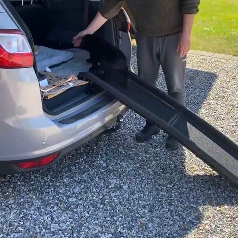Foldbar rampe i Alu som sikrer at hunden kommer sikkert ind og ud af bilen.