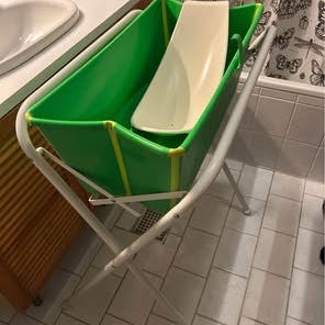 Stokke Flexi Bath XL hvid. Badekarret kan foldes sammen for at spare plads. Kan bruges, indtil de er seks år gamle.