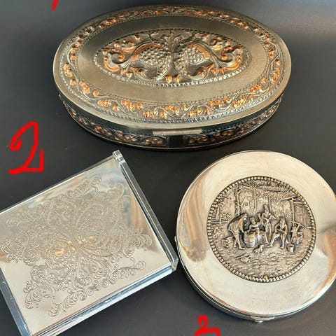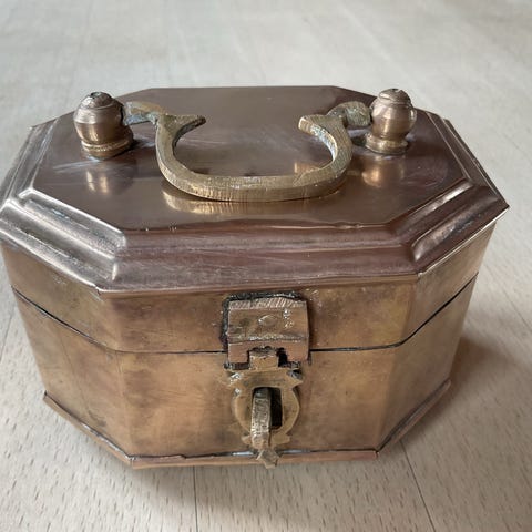 Smukt antikt asiatisk duftskrin i kobber/messing med dufthuller i låg. Måler H: 9,3 cm., Ø: 8 cm.