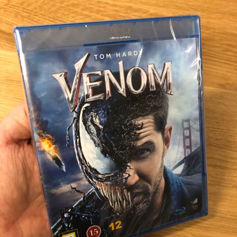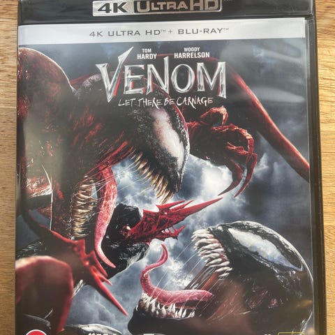 Venom Let There Be Carnage Blu-ray film. Udgivelse på Blu-ray med aldersgrænse 15 år / 12 i Norden. Omslag og disk viser, at filmen er en superhelte/actionfilm i Venom-serien. Egnet til afspilning på Blu-ray-afspillere, PlayStation og andre kompatible enheder. Indeholder ekstra materiale ifølge bagsiden, herunder bonusfeatures (præcis indhold fremgår af coveret).