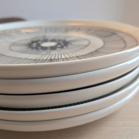 Sæt med 5 brugte Marimekko tallerkener – stilrent hvid/sort design, tåler opvaskemaskine og mikroovn. Skår på en enkelt tallerken. Diameter: 20,5 cm.