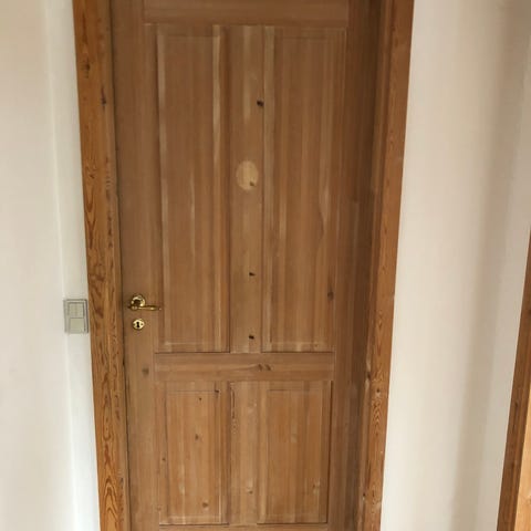 Tre gode, massive døre i bøgetræ - to højrehængte, en venstrehængt - inkl dørkarme, håndtag. Alm brugsspor men ingen større skrammer. Dør standardstørrelse M9x21 dvs 825x2040mm (karmmål 886x2089mm).