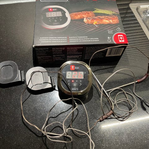 Weber iGrill 2 grilltermometer med Bluetooth-forbindelse. Termometeret gør det muligt at måle kernetemperaturen i kød og andre råvarer under tilberedning på grill. Enheden har digitalt display og kan forbindes trådløst via Bluetooth til kompatible enheder for aflæsning af temperatur. Velegnet til præcis temperaturkontrol ved grillning og stegning.