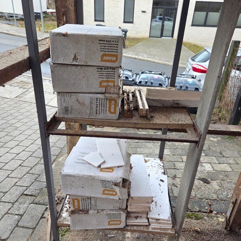 6 pakker med 66 fliser i hver. Omkring 8,9 m2.