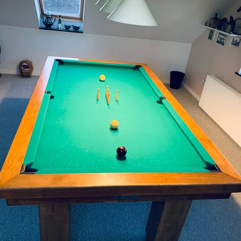 Pointtavlen, køer (5 stk + forlænger), baller og kegler, samt baller til poolbillardsspil
