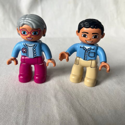 Far’en står og laver morgenmad i køkkenet. Han har mad på hylderne og på bordet. Mormor sidder og drikker kaffe og snakker med far’en.