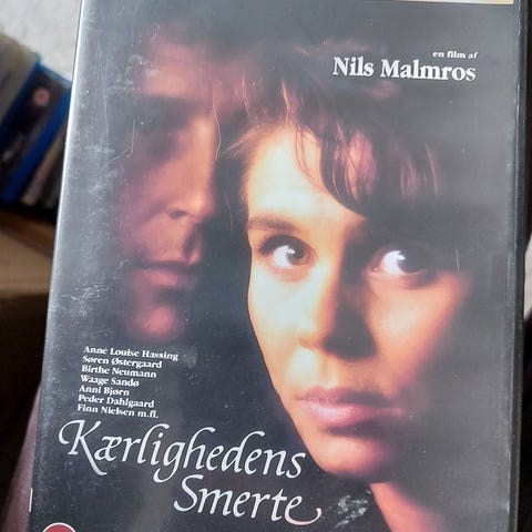 Kærlighedens Smerte DVD. Dansk spillefilm instrueret af Nils Malmros. Forsiden angiver aldersgrænse 15 år. Bagsiden oplyser spilletid på 115 minutter og produktionsår 1992. Filmen er udgivet på DVD med dansk tale. Emballagen viser desuden, at udgivelsen indeholder ekstramateriale som blandt andet filmografi, biografier, stills og trailer.