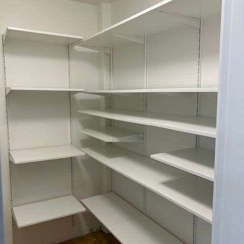 Der er pt hattehylde med bøjlestang samt to hylder til sko.