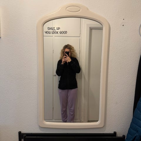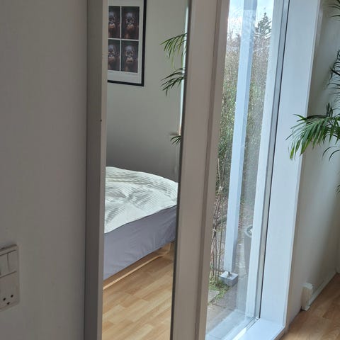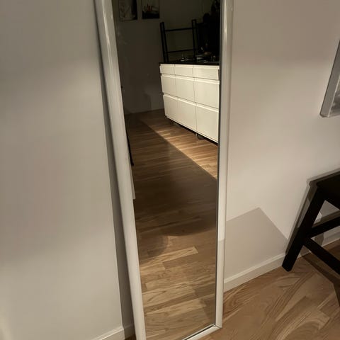 Hvidt spejl. Måler 55 gange 55 cm. Ramme i hvid måler 7,5 cm i hver side. DVS spejl er ca 40 gange 40 cm.