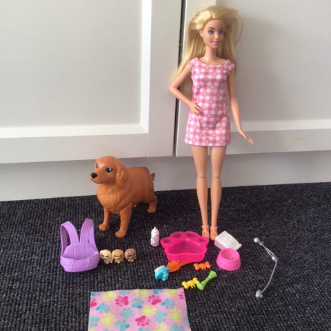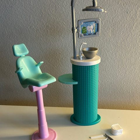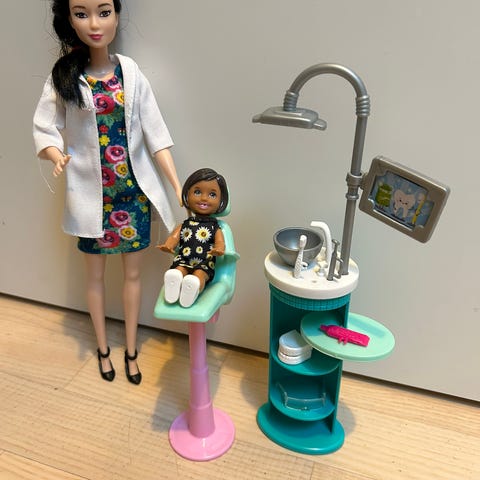 Barbie dukke tandlægesæt med Barbiedukke, barn og tilbehør som set på billederne.