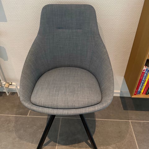 Sort stol fra Sinnerup med ødelagt tekstil på sædet, som skal repareres, deraf prisen. Alternativt kan der bruges en pude :-)