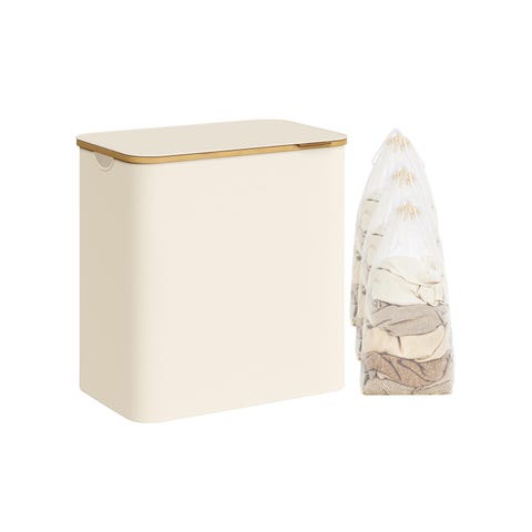 Hold styr på hele familiens tøj. Denne rummelige vasketøjskurv på 150 l måler 60 × 38,5 × 70,5 cm og har tre separate rum, så du nemt kan sortere før vask. Låget skjuler rodet, beskytter privatlivet og holder støv væk, mens den elegante detalje i kunstlæder fungerer som et praktisk håndtag til nem åbning.
