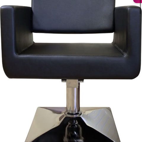 Frisørstol i sort kunstlæder med armlæn og rund metalfod med hydraulisk højdejustering. Stolen har polstret sæde og ryg samt drejefunktion, velegnet til brug i frisørsalon eller lignende behandlingsmiljøer. Sædet er udformet, så det giver støtte til ryg og arme under behandling. Materiale: kunstlæder og metalfod i kromlook.