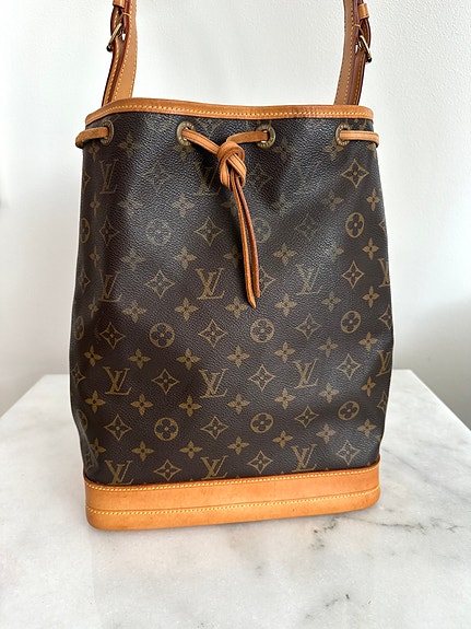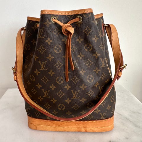 En ægte klassiker fra Louis Vuitton. Noé-modellen blev oprindeligt designet i 1932 til at transportere champagneflasker, og den ikoniske snørelukning er stadig en del af designet i dag. Denne er i klassisk Monogram canvas med naturfarvet læder og guldfarvet hardware. Tasken lukkes med den karakteristiske lædersnøre og bæres over skulderen med justerbar rem. Dato kode SP0966 betyder produceret i Frankrig, juni 1996. En smuk vintage Noé med masser af patina og historie.