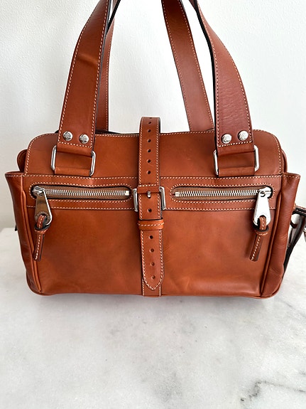 Canvas er flot med klar monogram. Læderet har patina, mørkninger og pletter særligt på bund og kanter. Indvendigt pæn med almindelige brugsspor. Rem og snøre fungerer som de skal.