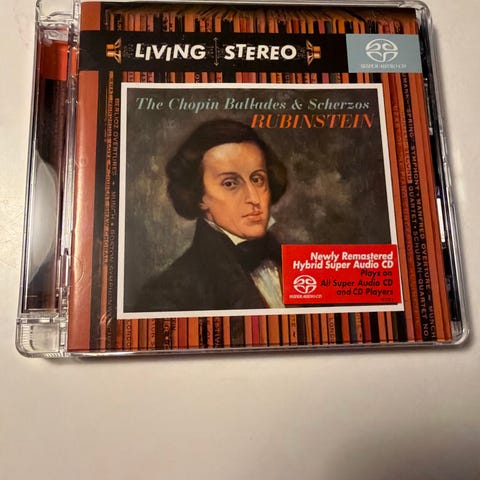 Rubinstein Chopin Concertos Nos. 1 & 2 CD. Udgivelse i serien Living Stereo med klaverkoncerter af Frédéric Chopin: Klaverkoncert nr. 1 i e-mol, op. 11 og Klaverkoncert nr. 2 i f-mol, op. 21. Indspilningen er med Arthur Rubinstein ved klaveret og symfoniorkester under ledelse af dirigent. Med standard CD-plade i plastikcover med for- og bagsideindlæg med værkoplysninger.